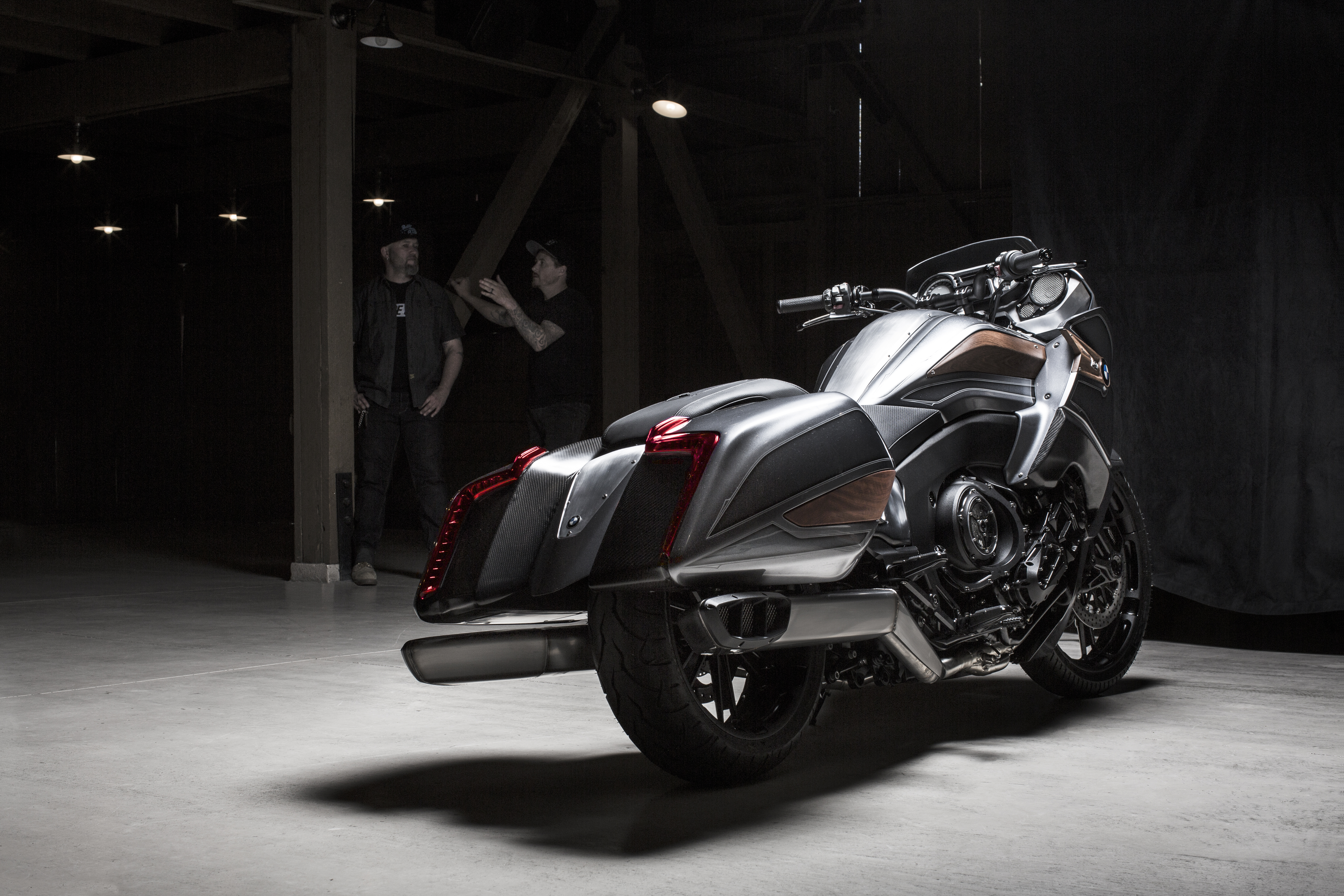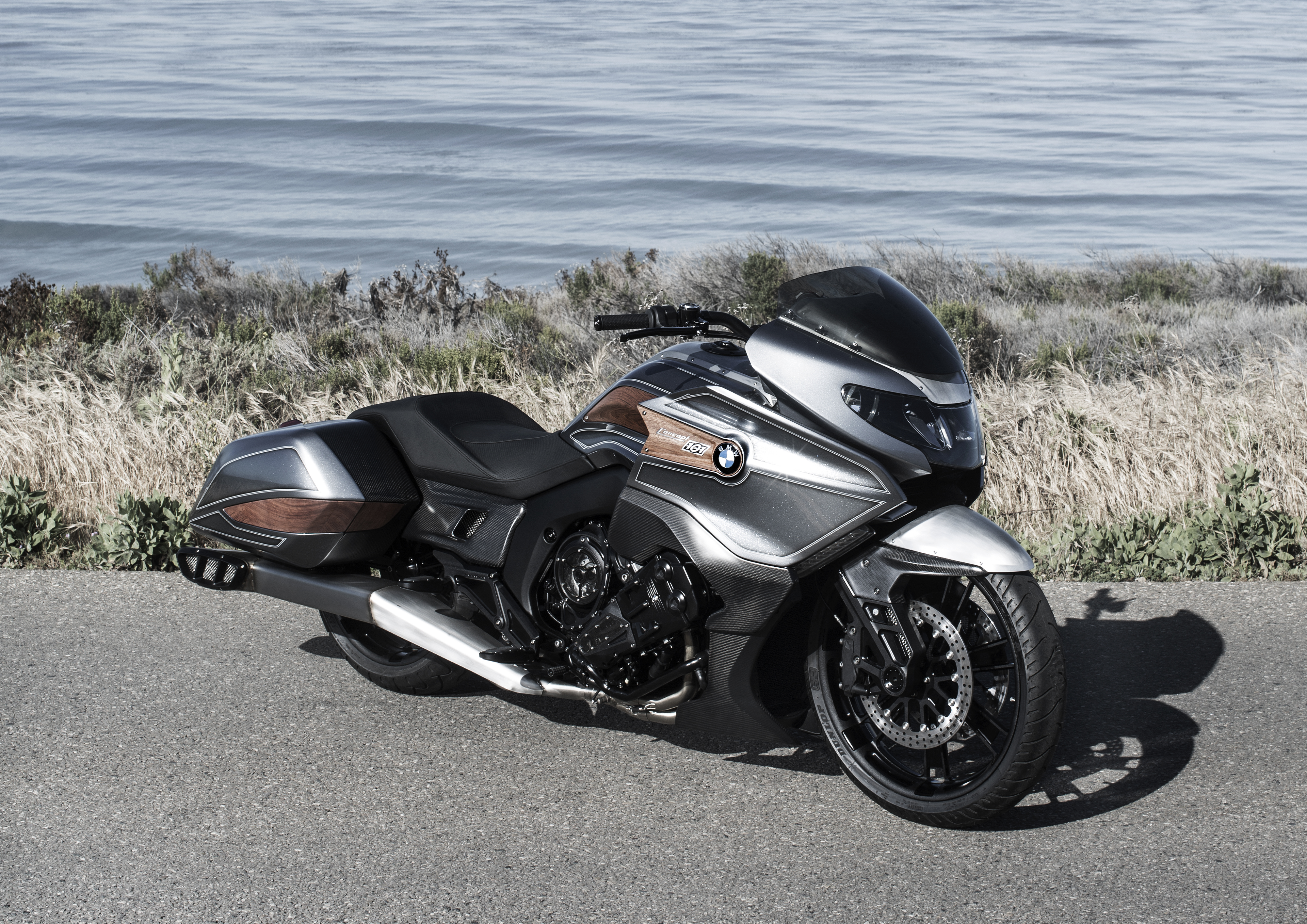 The dynamically designed front trim in brushed aluminium is flatly integrated into the flow of the styling. The integrated headlamp with striking double circular appearance gives the front section a distinct and highly expressive look. It also provides the point of departure for the characteristic split face which runs across the entire bike through to the rear in the form of a brushed aluminium trim section. Two striking side panels encase the front trim almost like a suit of armour, thereby creating a broad shoulder section which further highlights the power of the "Concept 101". Tailpipes on both sides, each with three outlets, visualise the number of cylinders and therefore the supreme performance and high torque of the engine. They also ensure the appropriate sound, making the potential of the 6-cylinder engine audible.