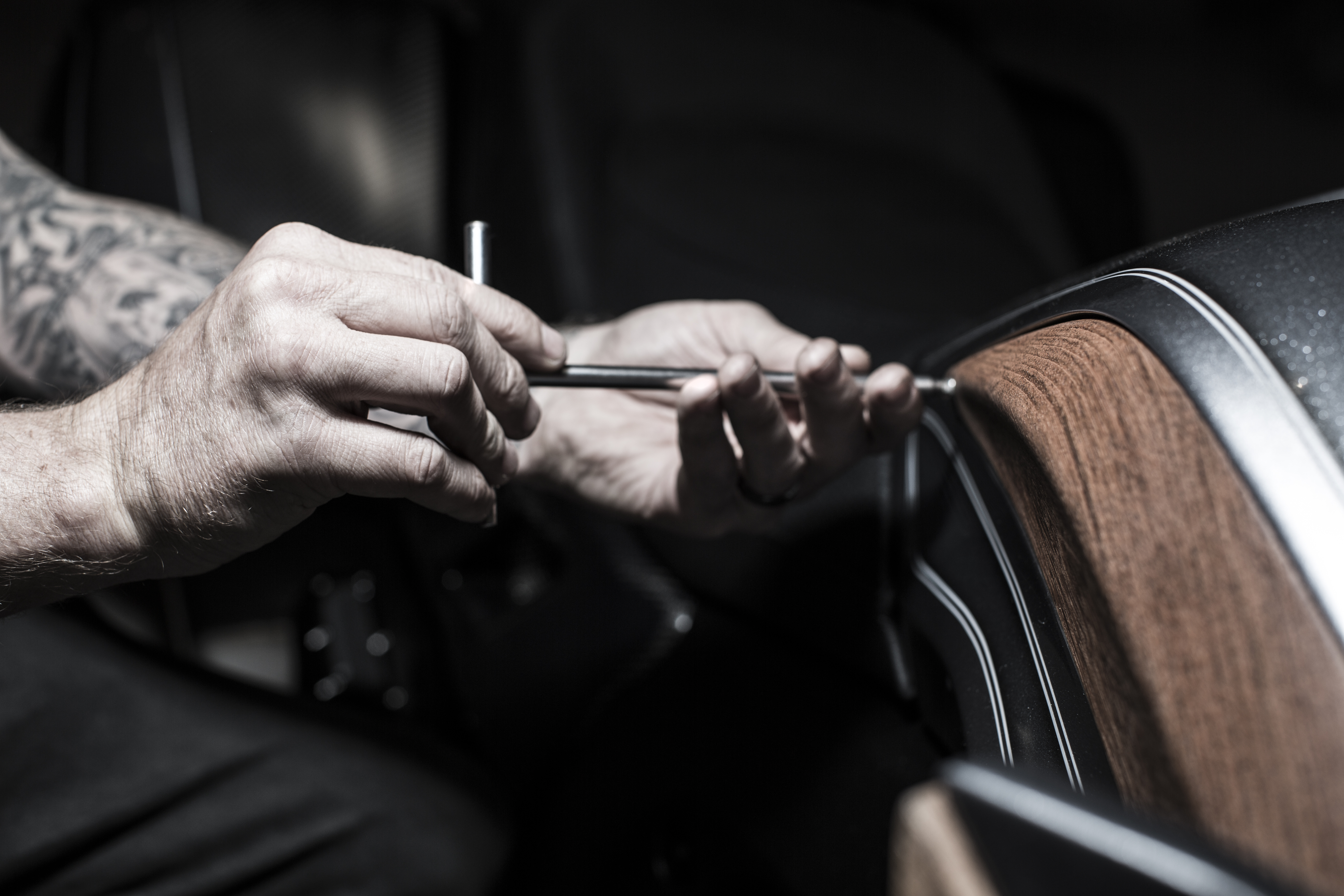 Amid silver paint surfaces, brushed aluminium and carbon, there are dark wood elements that add a warm, exclusive counterpoint. The elaborately milled wood, only treated with oil, emphasises the horizontal gesture of the side sections with its discreet grain. The model designation is integrated in the wood surfaces as an elaborate aluminium insert and badge. On the seat, two leather qualities further reflect the bike's exclusive character: the fine-grain black leather of the side sections adds a touch of elegance to complement the perforated black leather of the seat area itself. A brown leather strip separates these two distinct sections.