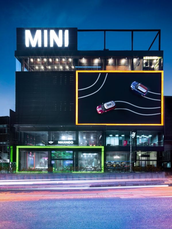 The building features a black façade with two full-size MINI cars on the exterior wall creating a unique, stylish and striking look. The unique design of the showroom fits the lifestyle of trend-conscious Jakartan urbanites as a great place for them to hang out.