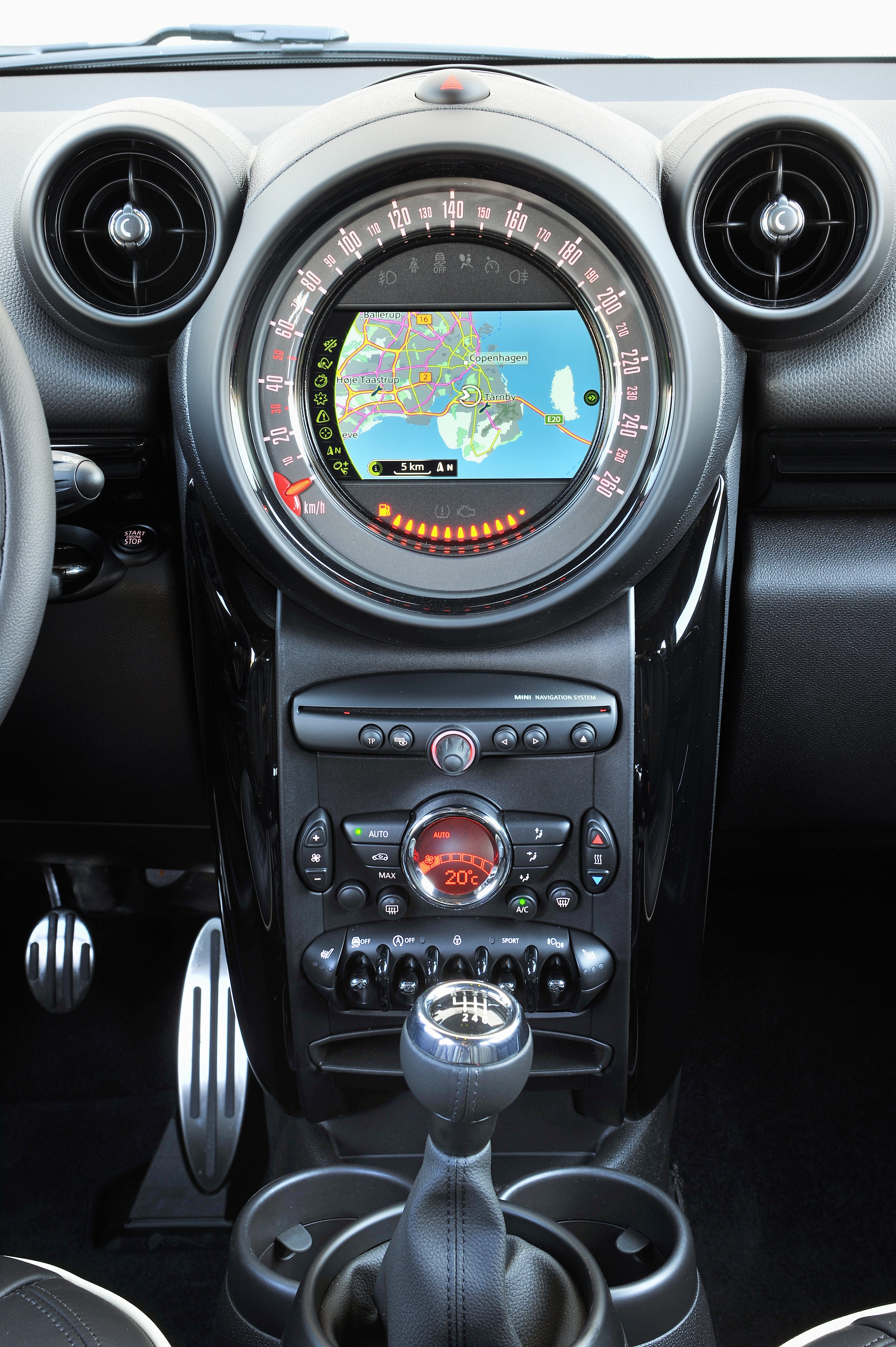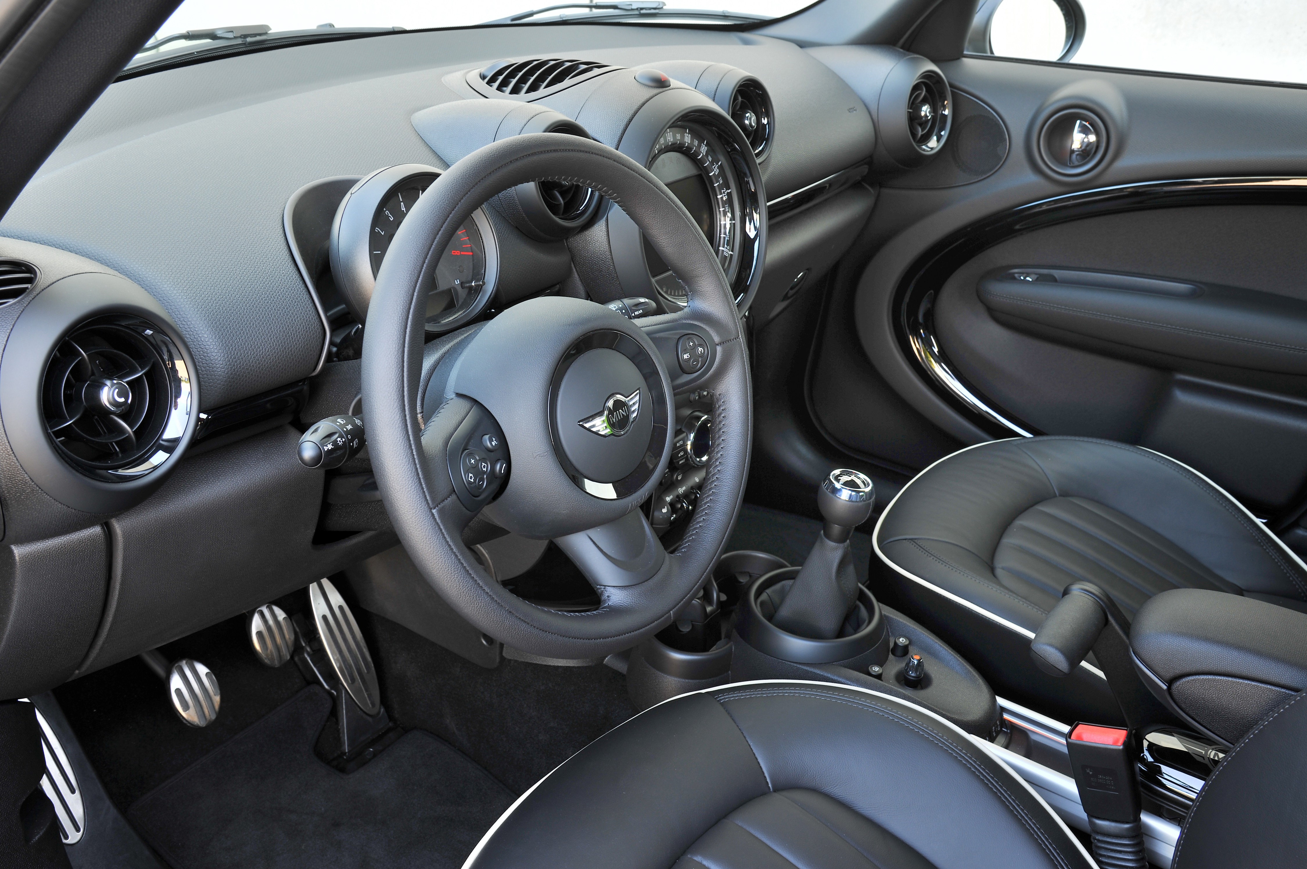 The displays and controls of the MINI Countryman have been redesigned so as to enhance the car's sporty flair and premium character. All model variants of the new MINI Countryman now have anthracite-coloured dials for the engine speed and road speed display in the style of the new MINI John Cooper Works Countryman, whose central instrument now also bears the John Cooper Works logo. The standard trim of the new MINI Countryman also includes chrome applications for the ventilation controls.